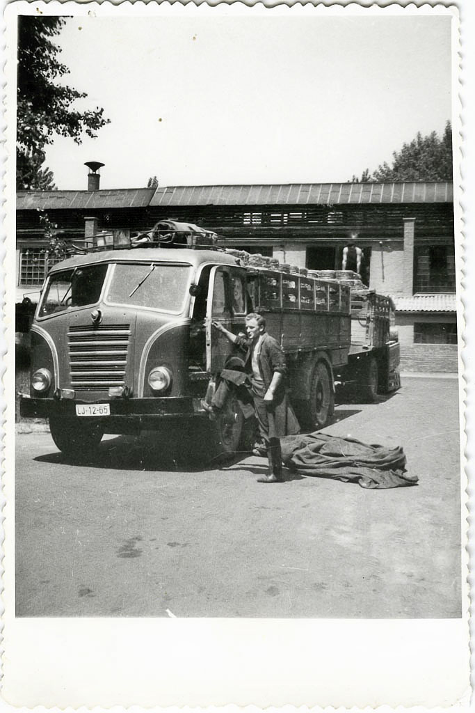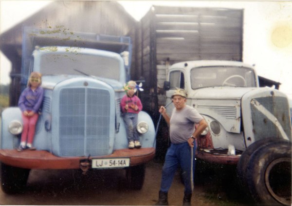 Leta 1967 je nekdo pritisnil Jožetov avtopark pred domačim skednjem. Takrat je bil že zasebni avtoprevoznik, kar je ostal vse do leta 2001, ko se je po 41 letih voženj po vseh mogočih cestah upokojil, star 53 let. Nekoliko je k temu pomagal beneficiran staž za poklicne voznike določenih kategorij, za katerega je kot zasebnik vestno plačeval prispevke vso delovno dobo. Tukaj je imel dva kamiona: enega s kiperjem za pesek, drugi pa je imel višje ograjen prostor za tovor – z njim je prevažal sekance, žagovino in podobne lažje razsute tovore. Enake znamke sta, enake barve, le starost je najbrž različna. Registrska številka levega je LJ*54-14A, desnemu se pa ne vidi, ker jo zaslanjata dve rabljeni gumi.
