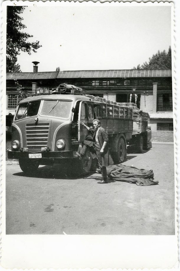 Tu je šlo za mednarodno špedicijo leta 1962. Na sliki je Jožetov sovoznik Franc Čampa iz Ortneka pri Kočevju, s katerim sta skupaj vozila v Nemčijo. Na kamionu s prikolico so naloženi pokončno postavljeni zvitki nečesa, vrata vozila pa se še udobno, a ne tudi varno, odpirajo naprej. Nad kabino je ograjica, ki pridržuje zvito cerado za pokrivanje tovora, na prikolici pa dve mišičasti roki zlagata zvitke tovora.