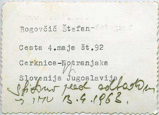 Na zadnji strani fotografije so zapisani vsi podatki lastnika slike in fička. Poleg osebnih podatkov piše še »slikano pred odhodom iz IMV, 13. 4. 1963«.