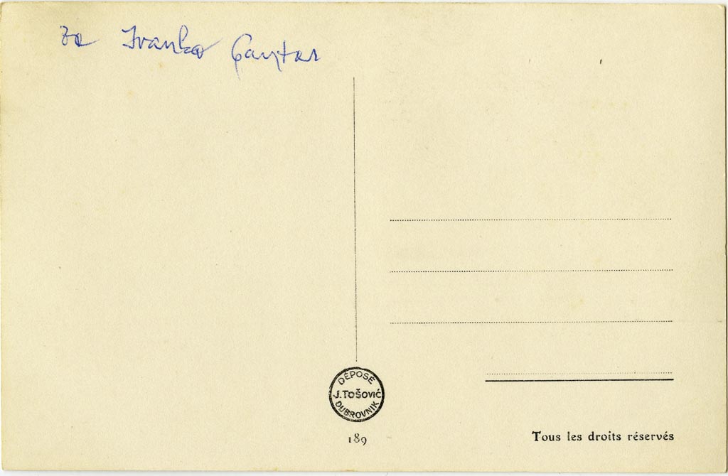 Razglednico je izdala Knjigarna J. Tošović iz Dubrovnika. Podarila mi jo je Helena Lovrenčak. Na zadnjo stran je napisala, da je zame.