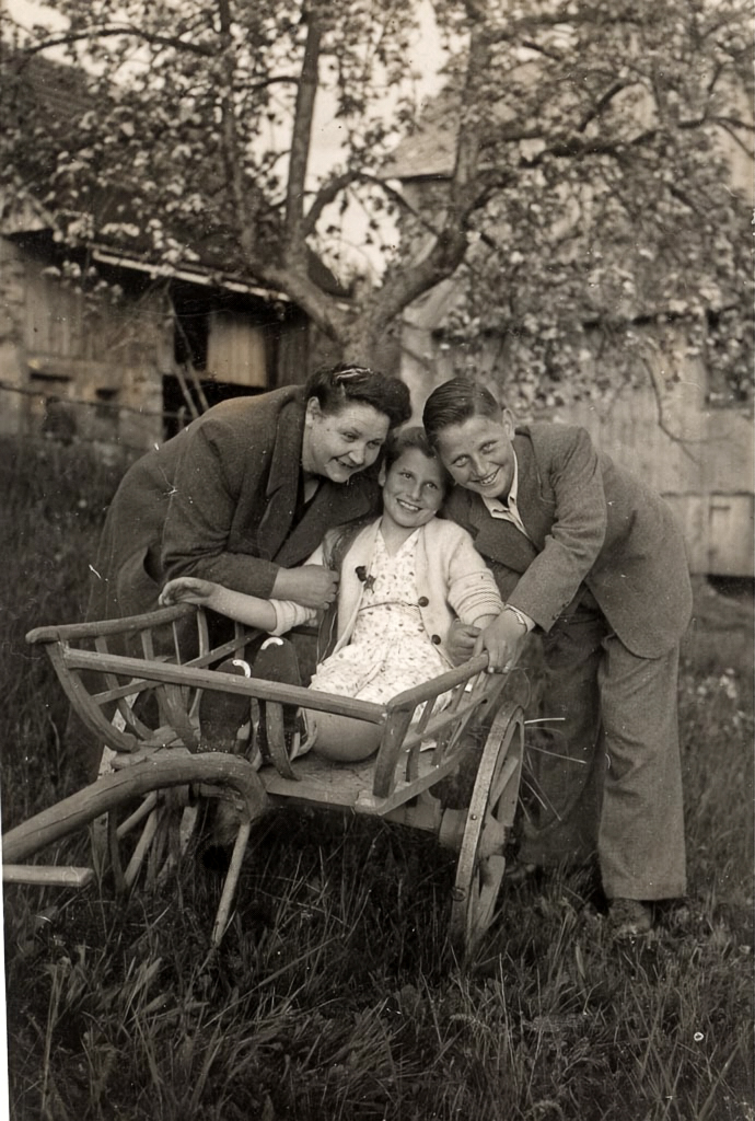 Tudi ostalih dveh mladih na sliki ne poznam – sicer pa je glavna zvezda tega prispevka tako ali tako korieta ali kočija. Tu v njej sedi odraščajoča deklica. Je bila posebna priložnost, da so bili dobre volje in so jo za hec posedli v korieto ali deklica ni mogla hoditi? Raje verjamem v prvo, saj je videti nasmejano sproščena, na obleki ima praznični šopek, na nogah pa trdne čevlje s podkovicami na prstih.