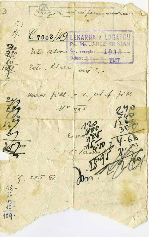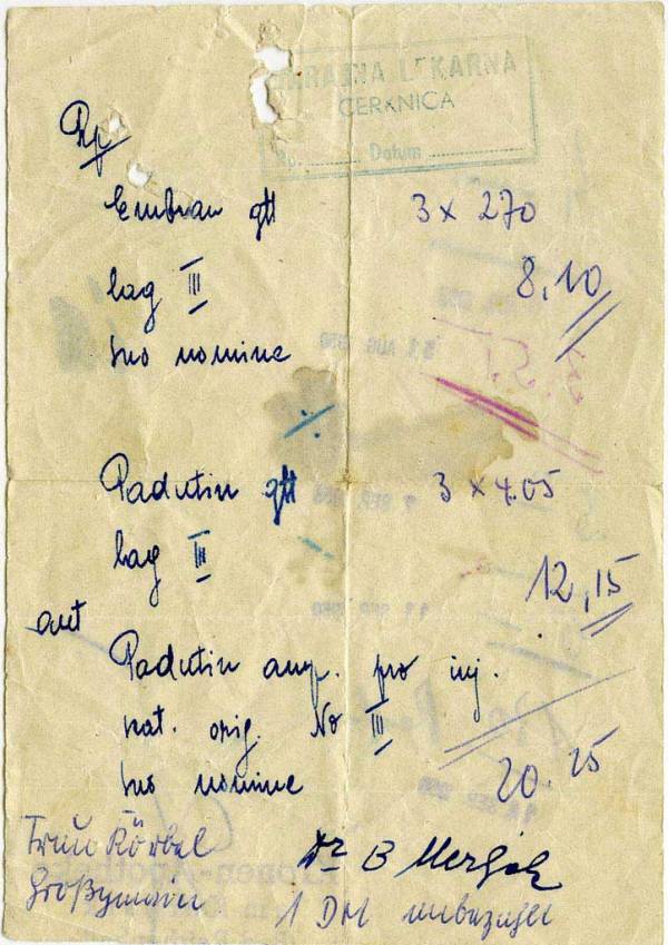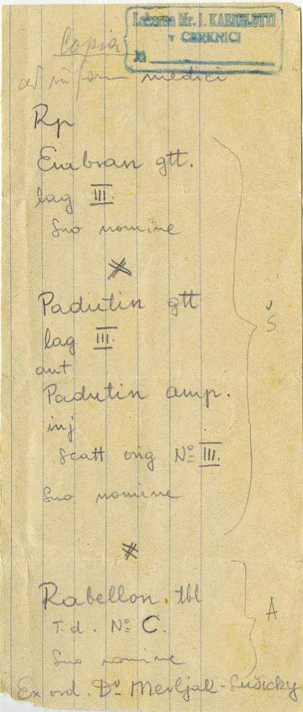 Dr. Stanko Pušenjak je izdal recept za karkoli že. Upam, da so znali v lekarni prebrati. Izdan je bil 1. avgusta 1941. Pacient je zdravila dvignil v lekarni v Logatcu, ki je na recept pritisnila tudi svoj žig.