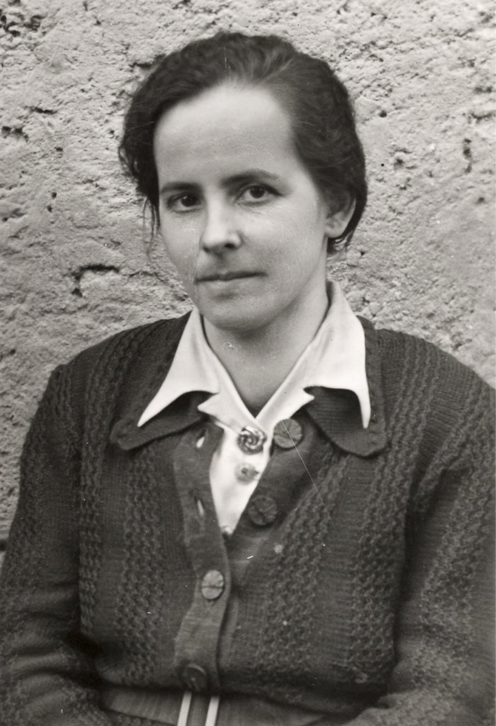 Na tej fotografiji pa je naša teta Julka, ena od starejših maminih sester, ki je tudi še nisem videla. Točne letnice nastanka ne morem določiti, vsekakor sodi med leti 1945, ko se je Franc Truden vrnil iz ujetništva in oživil predvojno dejavnost, in letom 1954, ko so bili Hlepinovi že v novi hiši in njegove fotografije niso več nastajale pred tem zidom.