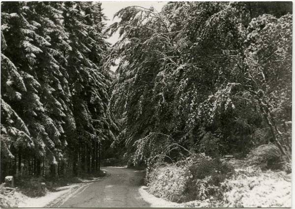 Zimska idila prikazuje cesto na Kalič, ko je zapadel prvi sneg. To se je zgodilo 10. oktobra 1974. Drevesa snega še niso pričakovala. Olistana so se pod težo mokrega snega upognila.
