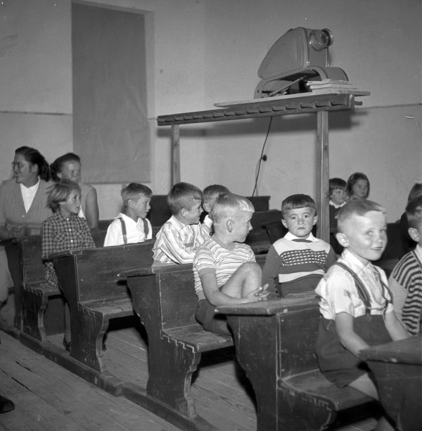Tudi obvezen kupček knjig za nastavitev višine pod prvo nogo episkopa se vidi. Brez njih bi bila slika projicirana prenizko, kar naravnost v glave učencev…