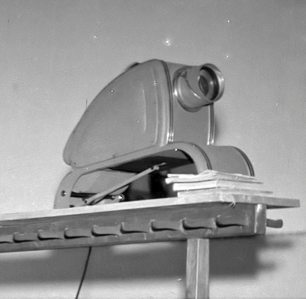 Na nekakšen pladenj na spodnjem delu episkopa je tovarišica položila knjigo ali list papirja, z ročico, ki je vidna tudi na sliki, je pladenj dvignila pod episkop in že je bila projicirana slika vidna na platnu.