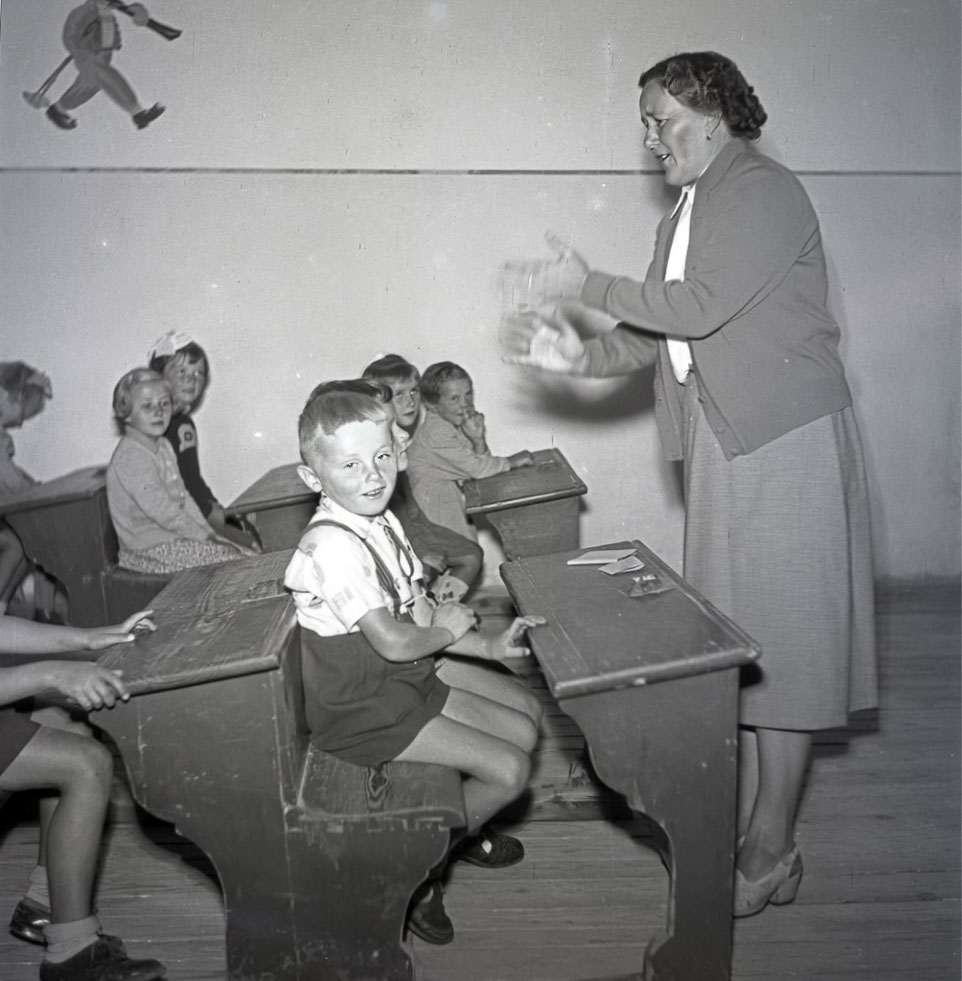 Prva ura pouka je bila sproščena. Otroci gledajo na vse strani. V zadnji klopi levo sedi nasmejana Ludovika Bavdek, ki je takrat ravno začela poučevati na begunjski šoli.