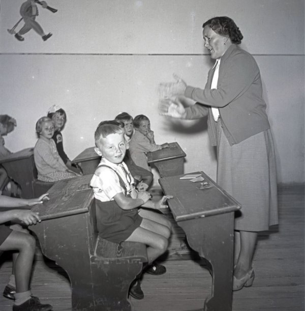 Prvarčki so prišli prvič v šolo. Učiteljica, takrat smo jim rekli tovarišica, jim je razložila, da šola ni nič hudega, da pa se bodo veliko naučili. Prvi razred je tisto leto učila Justina Rode, ki je na šoli ostala do svoje upokojitve.