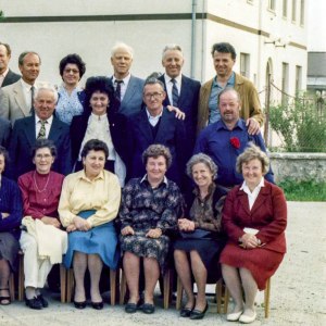 Tako so se zbrali pred šolo v Begunjah. Njihova šola je bila med vojno požgana, precej se je spremenilo, le zid okrog šole in ograja sta še kljubovala zobu časa.