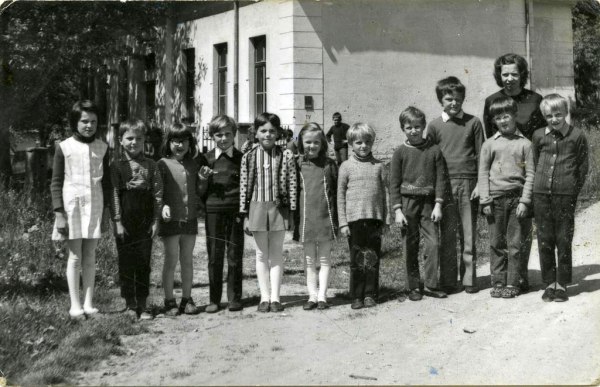 V vrsti stojijo: Danica Kraševec 1.r (Hribarjevo), Ludvik Mramor 2.r (Ulaka), Jana Škrlj 1.r (Sleme), Alojzij Seljak 1.r (Lovranovo), Danica Mestek 1.r (Bočkovo-Graben), Sonja Otoničar 1.r (Hribarjevo), Milan Otoničar 1.r (Sleme), Dušan Klančar 2.r (Zales), Metod Kraševec 2.r (Jeršanovo), Franci Mestek 1.r (Hiteno), Bojan Korošec 2.r (Hiteno) in za njimi stoji razredničarka Milka Mišič. Prav zadaj ob šoli pa vse dogajanje opazuje starejši učenec Darko Žnidaršič iz Malnov.