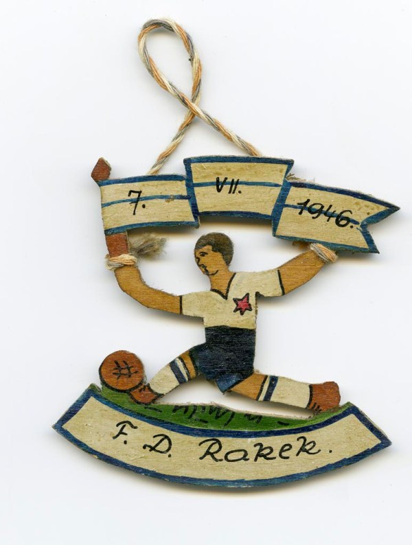Iz lesa narejen obesek z nogometašem, datumom 7. julij 1946 in napisom FD Rakek mi je podarila gospa Helena Lovrenčak.