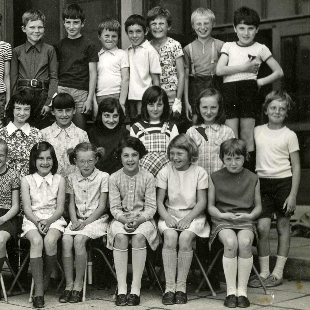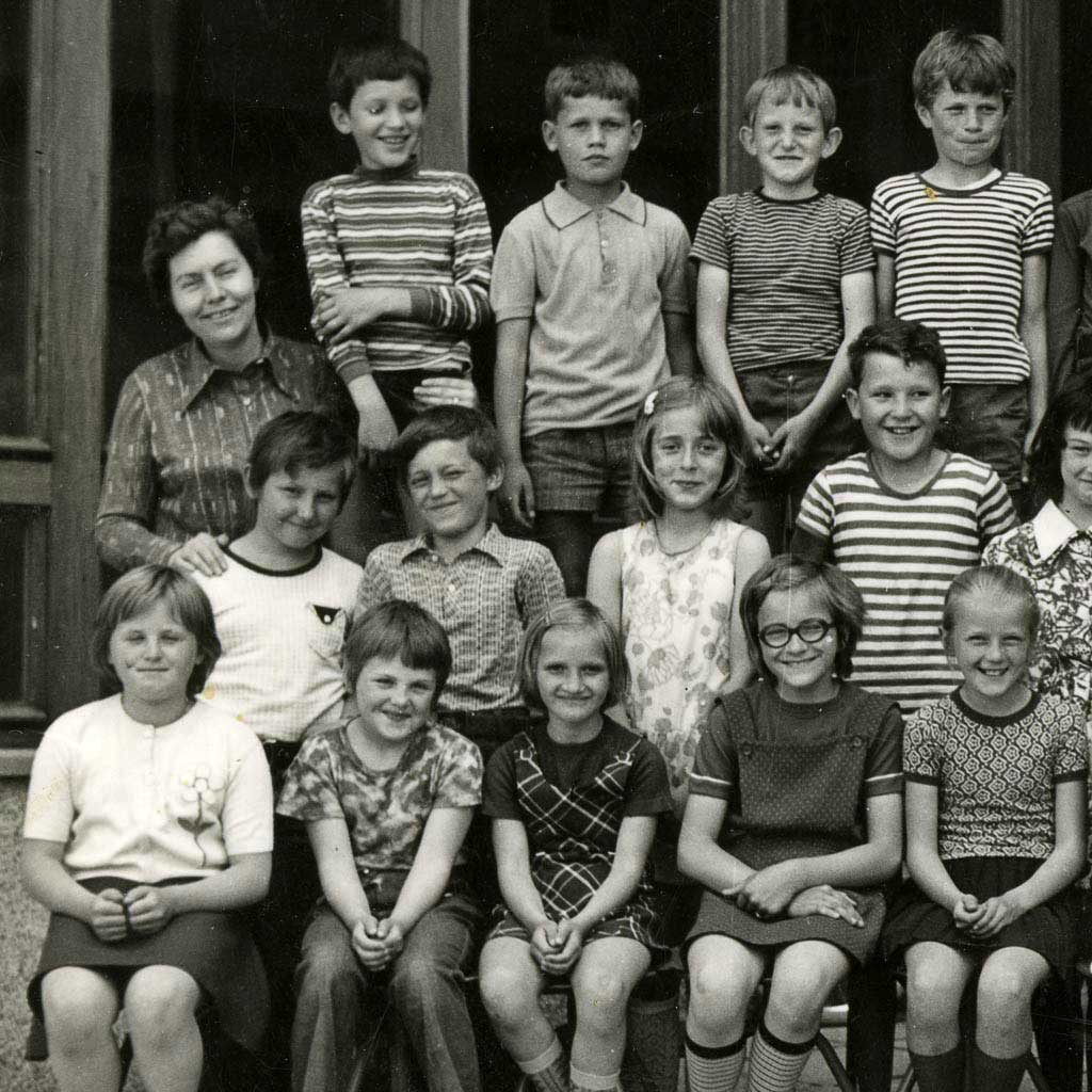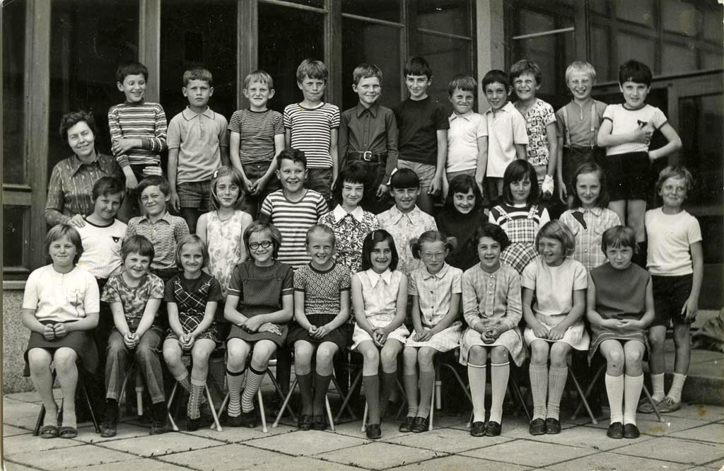 V šolskem letu 1973/74 so se pred osnovno šolo v Cerknici slikali učenci 3.a razreda. Takole dobro razpoloženi so se postavili pred fotografa. Z njimi je slikana tudi njihova razredničarka Bibijana Bavdek. Učiteljica, ki je izžarevala neko posebno milino in dobroto. Svoje učence je imela zelo rada, kar je lepo videti tudi na sliki. Kar dva učenca sta bila deležna njene pozornosti. Zabavanje fotografa je vedno pričaralo nasmehe na obraze. Tudi poškodovana roka ni pokvarila razpoloženja.
