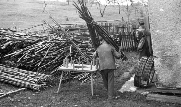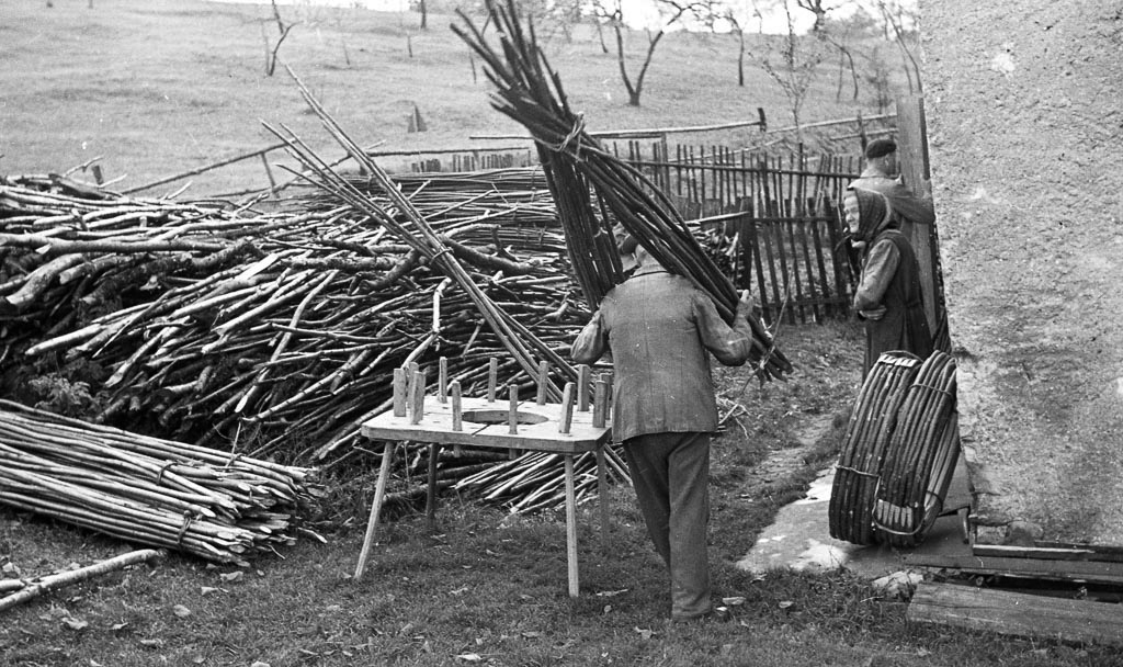 Pred obročarjevo hišo je precejšnja zaloga leskovih palic