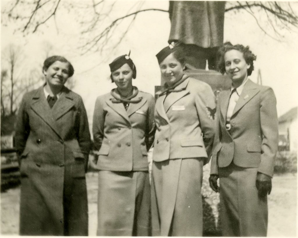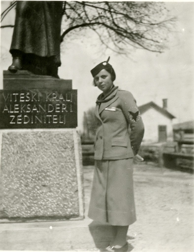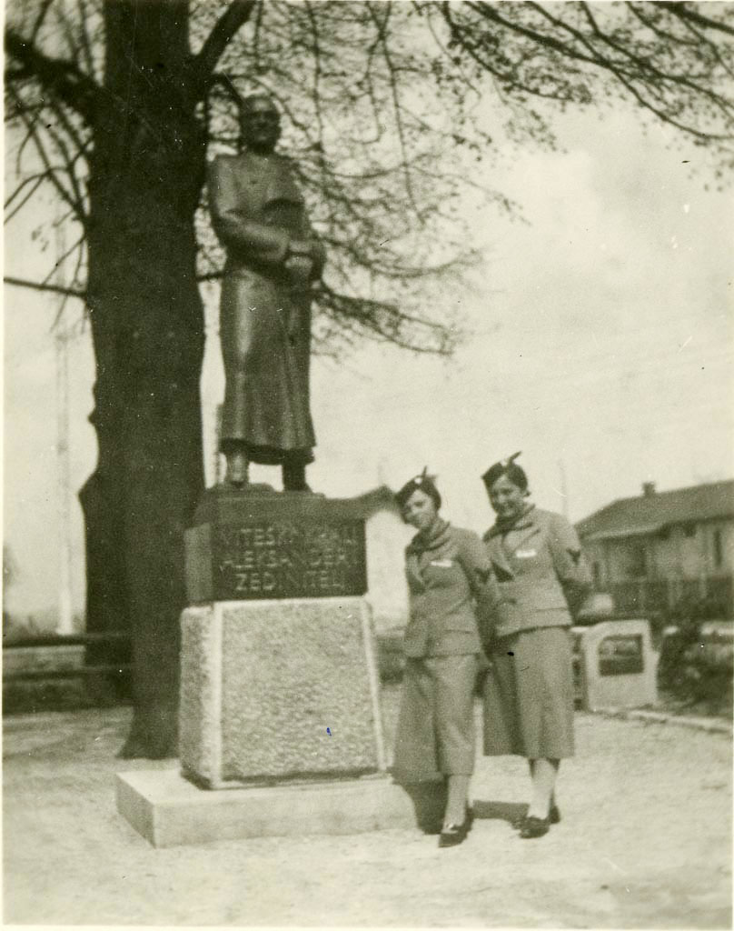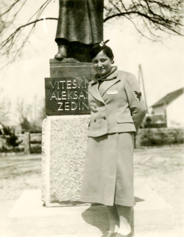 Štiri mladenke, dve sta Sokolici, pozirajo pred spomenikom kralju Aleksandru I. na Rakeku. Žal ne poznamo nobene.