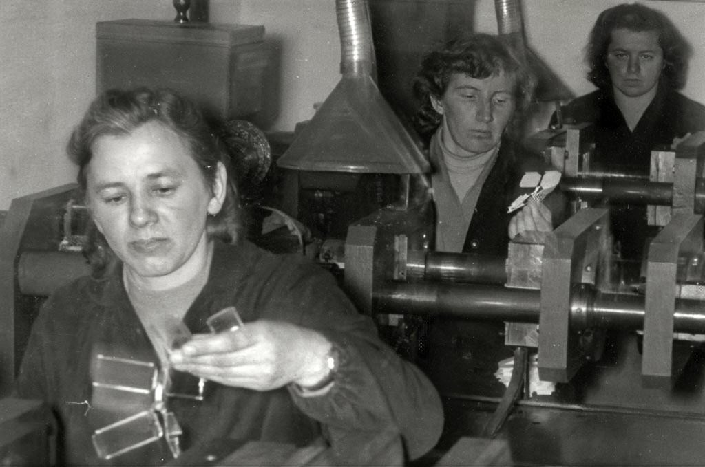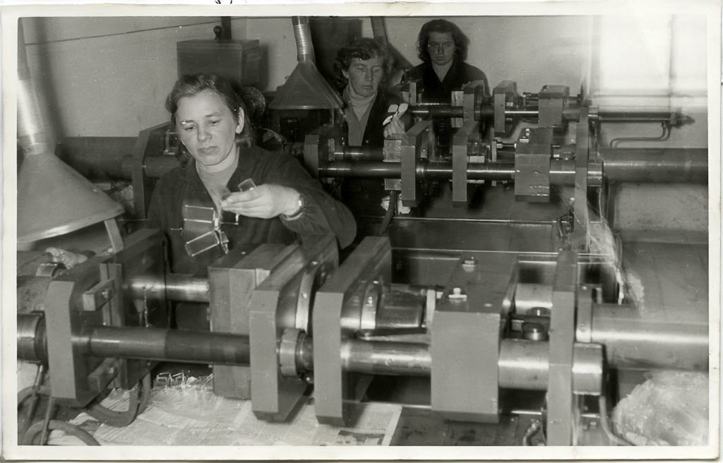 Prva delavka, s pravkar izdelanimi deli škatlic za tablete Phenalgol v roki, je Mira Mlakar iz Pudoba, druge, ki je tudi pravkar vzela izdelek iz stroja, ne poznam, v ozadju pa je moja mama Zofija Mulec, ki se je tu zaposlila med prvimi leta 1959 in doživela vse radosti in tegobe proizvodnje, ki se je komaj postavljala na noge.