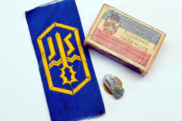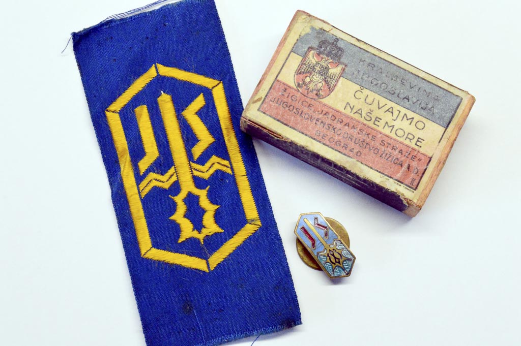 Na sliki so oznake Jadranske straže: rokavni trak s položajno oznako, značka in vžigalice. Simbol Jadranske straže je bil Markov buzdovan, napol potopljen v morje in črki JS. Stvari hrani in jih je fotografiral dr. Uroš Košir.