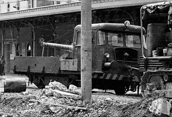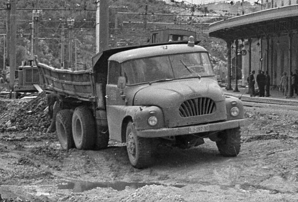 Legendarna češkoslovaška Tatra 138, nesporna kraljica slovenskih gradbišč v 60. in 70. letih prejšnjega stoletja, dovaža material za medtirni peron v Postojni. Proizvajali so jo v obdobju 1959-1971, poganjal pa jo je osemvaljni, zračno hlajeni, dizelski motor z močjo 133 kW. Njena posebnost so bila poševno postavljena kolesa, ko ni bila obremenjena s tovorom. Pri polni obremenitvi so se kolesa poravnala in bila pravokotna na cesto.