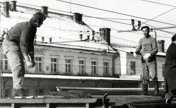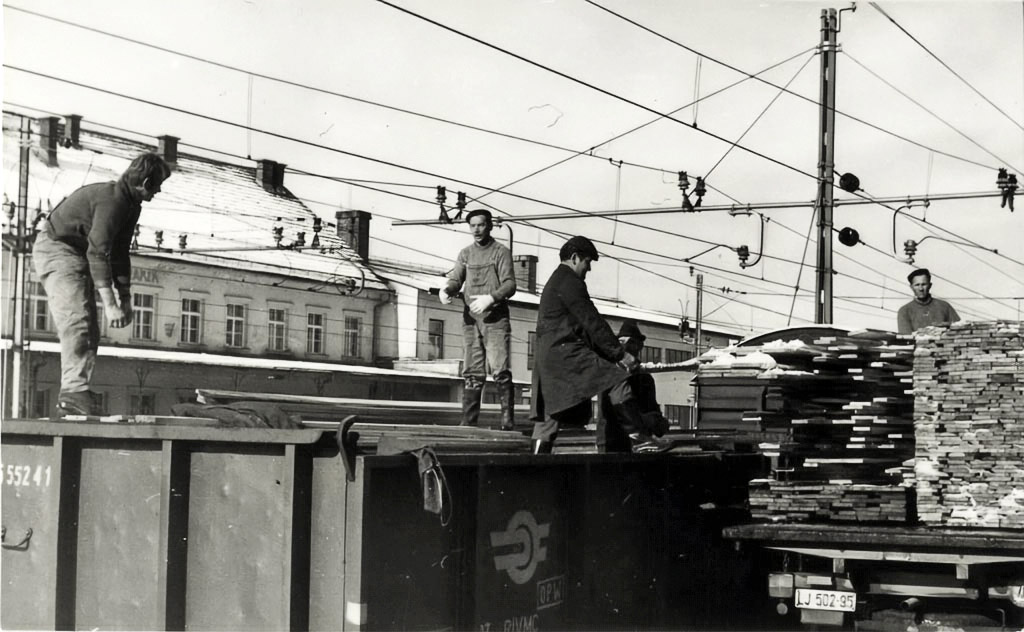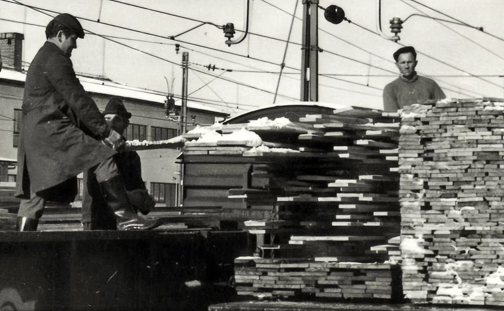 Delavci Brestove špedicije na Rakeku pri vsakodnevnem delu: nove in nove pošiljke rezanega lesa v zimi 1973/74. Rakovški ramparji s tovornjaka prekladajo colarce v madžarski vagon, a še ni nujno, da bo tovor šel na Madžarsko. Les je zrasel v Notranjskih gozdovih in bil razžagan na eni od Brestovih žag.