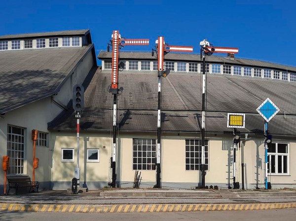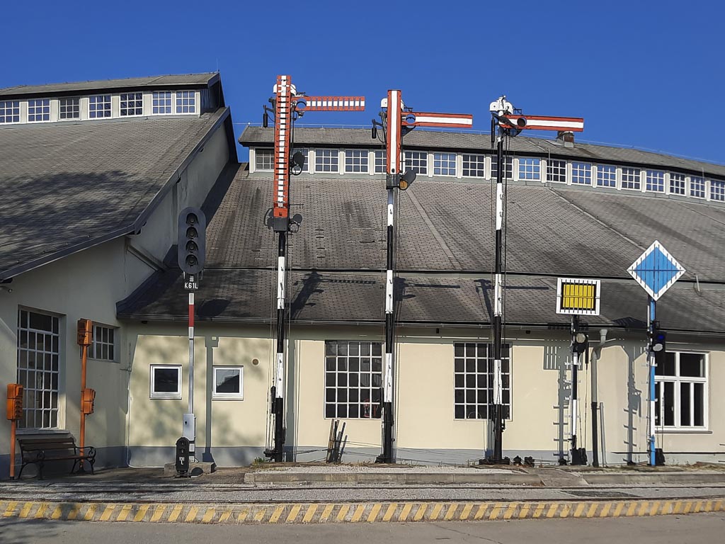 Pogled na ohranjene signale v železniškem muzeju, maj 2022. Od leve proti desni si sledijo: štirilučni svetlobni signal, ki je zamenjal likovne signale. Sledi troročični likovni uvozni signal z luknjami zaradi upora vetra, dvoročični signal in enoročični signal. Vsi trije kažejo signalni znak “stoj”. Sledita še rumeni predsignal, ki se je nahajal pred uvoznim signalom na zavorni razdalji 700 m in modri območni premikalni signal, ki je bil na postajah z večjim številom premikalnih voženj.