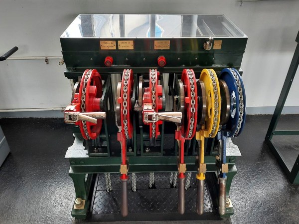 Postavljalna naprava za likovne signale v železniškem muzeju (maj 2022). Z rdečimi vzvodi se prestavljajo glavni signali, z rumenim predsignal in z modrim premikalni signal.