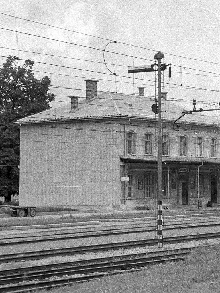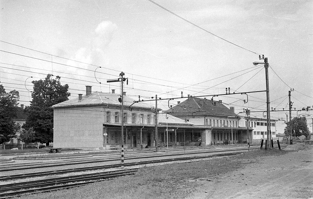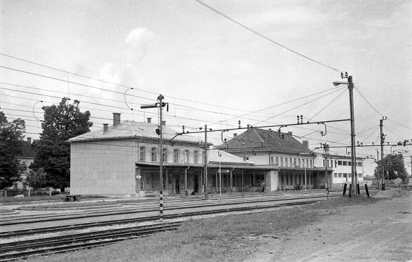 Pogled na železniško postajo Rakek leta 1965. Poleg postajnega poslopja se nahaja sodišče, za njim se gradi nova pekarna, ki je danes stanovanjski objekt. Med tiri izstopa enoročični likovni izvozni signal za vlake, ki vozijo proti Postojni.
