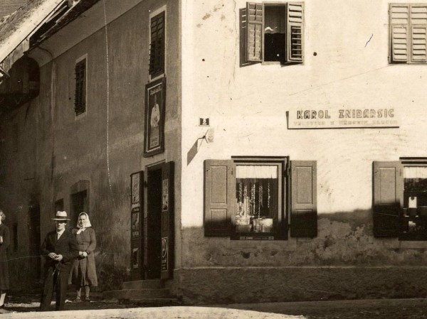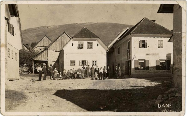 Nedvomno je moral biti praznik, da se je toliko vaščanov v boljših oblačilih zbralo sredi vasi, pred odprto(?) trgovino, ki nosi napis Karol Žnidaršič. Drevo na levi je olistano, ljudje pa nosijo prehodne obleke, ne prav poletne, a tudi zimske ne, nekatere nožice so gole, druge v nogavicah … Kakšen dan bi mogel biti?