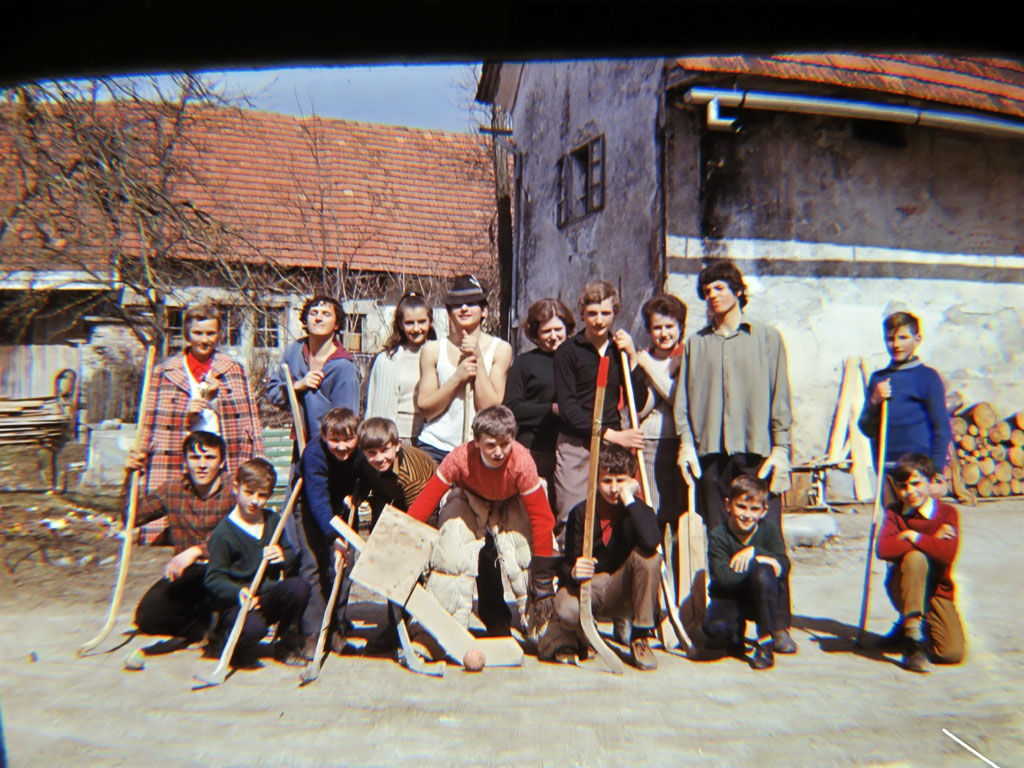 Velikokrat so se dobili na Cencovem dvorišču, ki je bilo primerno veliko, pa še Cencov ata je bil zelo vesel, saj so dvorišče prav lepo zgladili. Tudi ta slika je nastala na Cencovem dvorišču, kjer se je poleg hokejistov zbralo tudi nekaj navijačev.