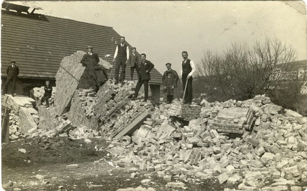 Zanimiva in verjetno ena redkih fotografij porušenega visokega dimnika ob Opekarni Avgusta Bella.