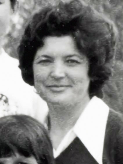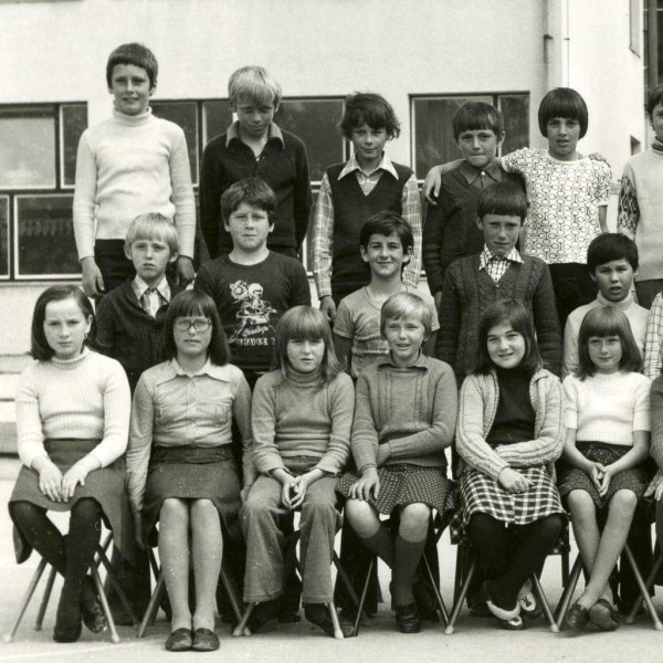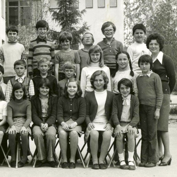 Razredničarka Vika Tornič in učenci 4. a razreda v šolskem letu 1975/76, slikani med šolskim igriščem in šolo.