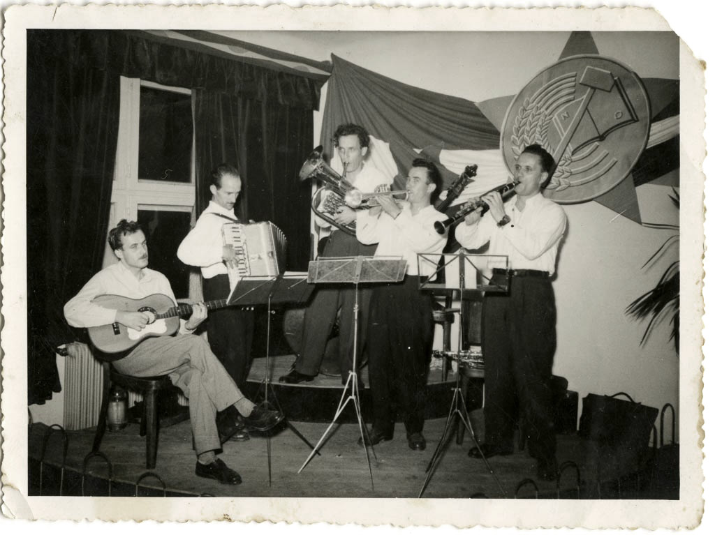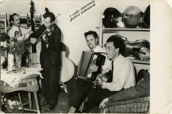Na fotografiji ansambel ERMAVISTA, Stane na harmoniki. Na zadnji strani piše le »Razstava« brez letnice. Pomenljiv je napis na steni »V vsako stanovanje glasbeni instrument«.