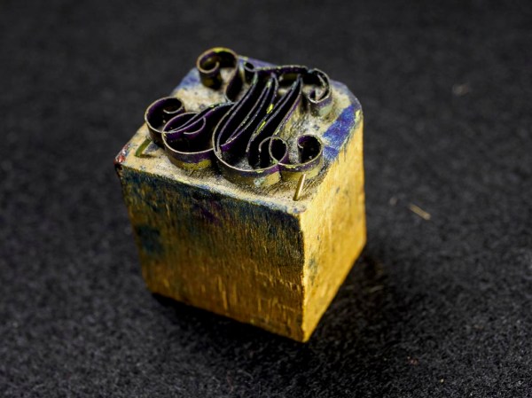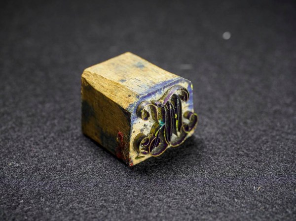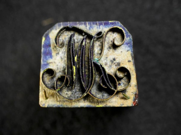 To je zrcalna slika žiga s čudovito oblikovanima prepletenima črkama M in K, ki jo je izmojstril urednik te spletne strani Miloš Toni. Gledamo torej tisto, kar je ostalo na podlagi, ko je bil žig odtisnjen. Žig ni gumijast, ampak kovinski, ne prav velik, mogoče 5×5 cm in ni čisto jasno, kako in kje so ga uporabljali. Nekako se mi zaradi distančnikov ob robu ponuja misel, da so ga odtisnili v mehko opeko, ki je začela ali končala serijo, čeprav so na njem sledi modre barve in ne gline. Lahko pa je preprosto služil samo na papirju pri dopisovanju … V ostrih kotih med vijugami črk pa so res ostanki nekakšne mase, ki pa je, tako kot barva, tja lahko prišla tudi pozneje …