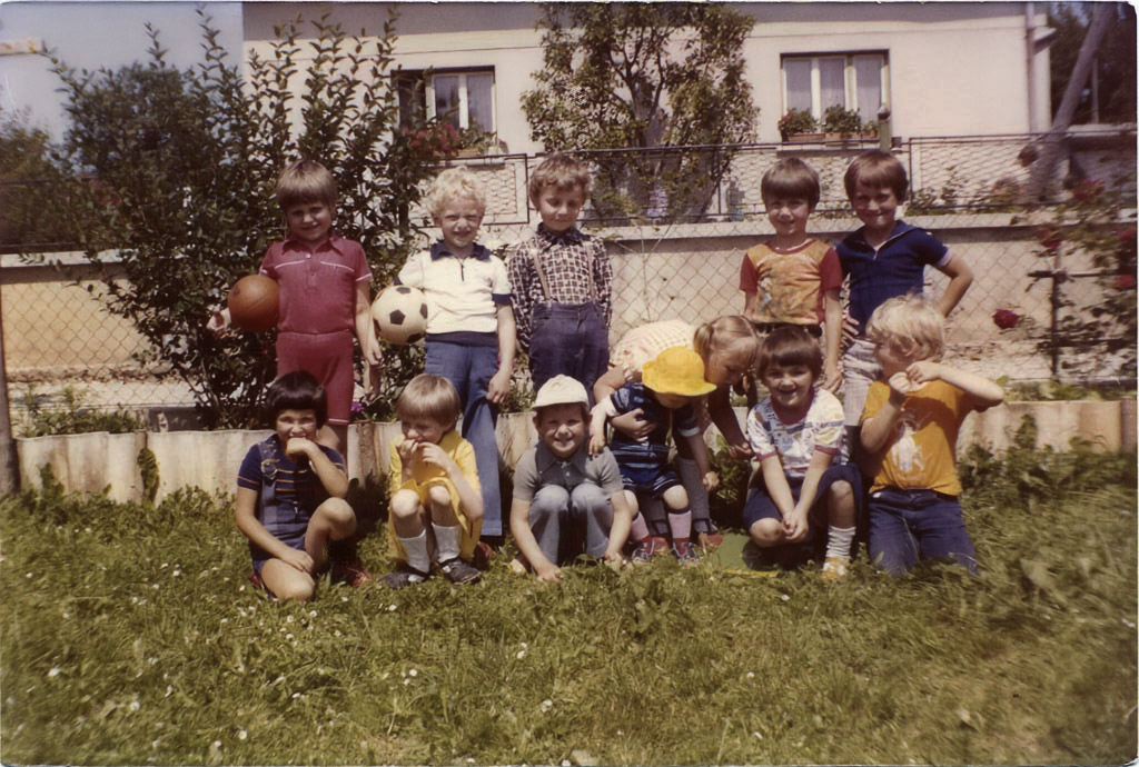 Da je lažje poskrbela zanje in jih zavarovala pred prometom, so se ustavili na njenem ograjenem vrtu, kjer so se lahko brezskrbno igrali. Najbrž so prevladovale igre z žogo, saj ju Janez In Erik na sliki ponosno razkazujeta. Ob tej priložnosti je ob vrtni ograji nastala spominska fotografija. Zadovoljni in nasmejani obrazi pričajo o lepo preživetih uricah. Pridružila se jim je Polonina starejša hčerka Urška s svojo najljubšo igračo. Ugibam, ali je to medvedek, mucek ali psiček. Mateja se je vživela v vlogo mamice. Trudi se, da bi vsi trije pogledali v objektiv, pa ji ni pravočasno uspelo.