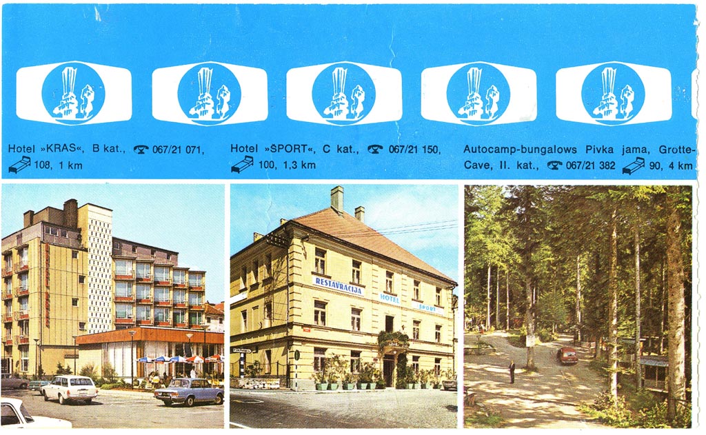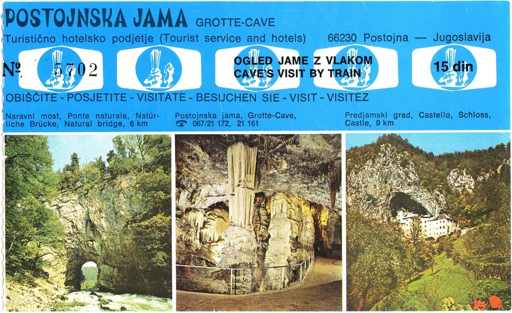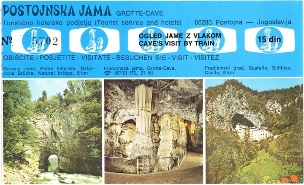 Vstopnica za obisk Postojnske jame je nekje iz sedemdesetih let 20. stoletja. Ker je na sliki tudi že Rakov Škocjan, sklepam, da so take vstopnice prodajali po aprilu 1973. Tedaj se je podjetje Škocjan – gostinski del združilo s Turistično hotelskim podjetjem Postojnska jama. Poleg Rakovega Škocjana sta na sliki še najlepša kapnika Postojnske jame in Predjamski grad, na drugi strani pa hotel Kras, hotel Šport in kamp Pivka jama.