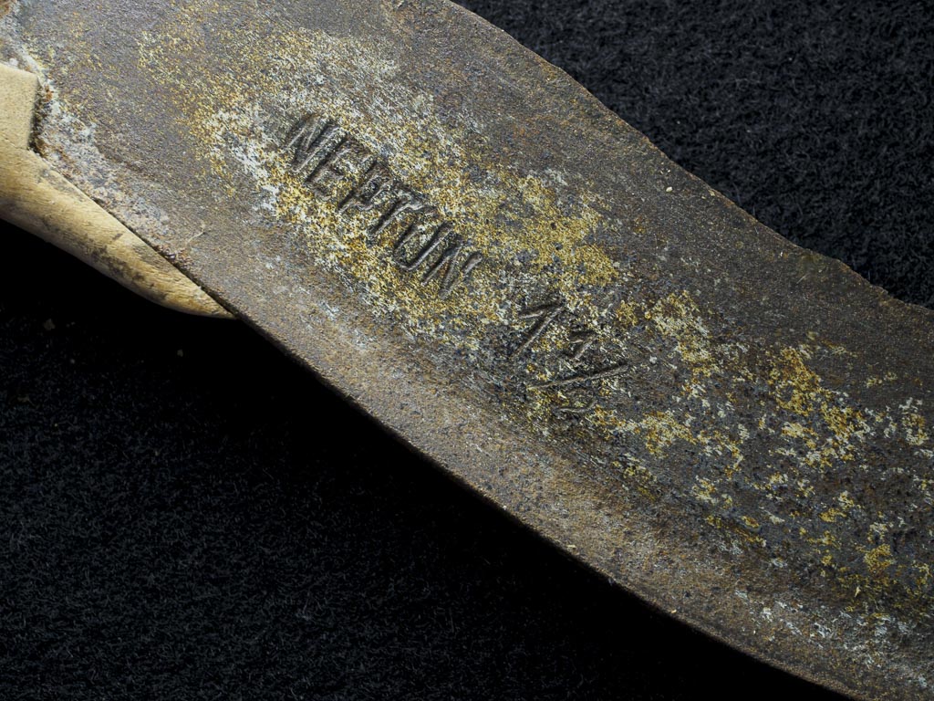 Srp, ki ga je z doto prinesla naša mama iz Topola, ima v rezilu vtisnjen znak NEPTUN in št. 1 1/2. Najbrž znak proizvajalca in širino rezila v colah.