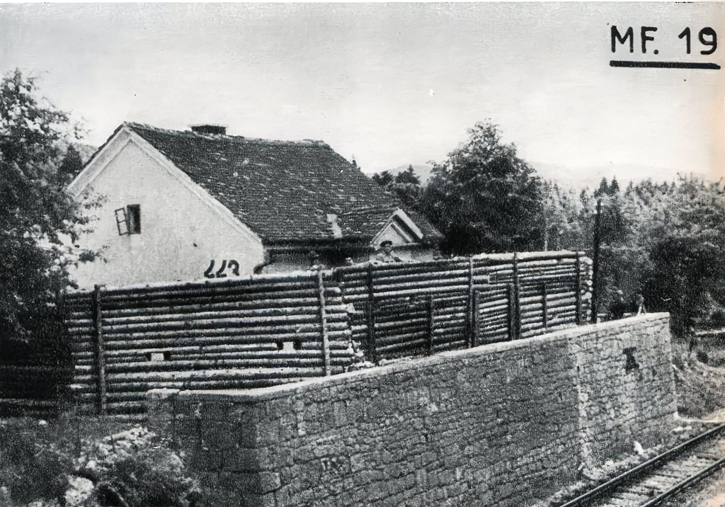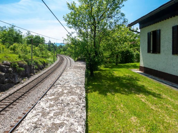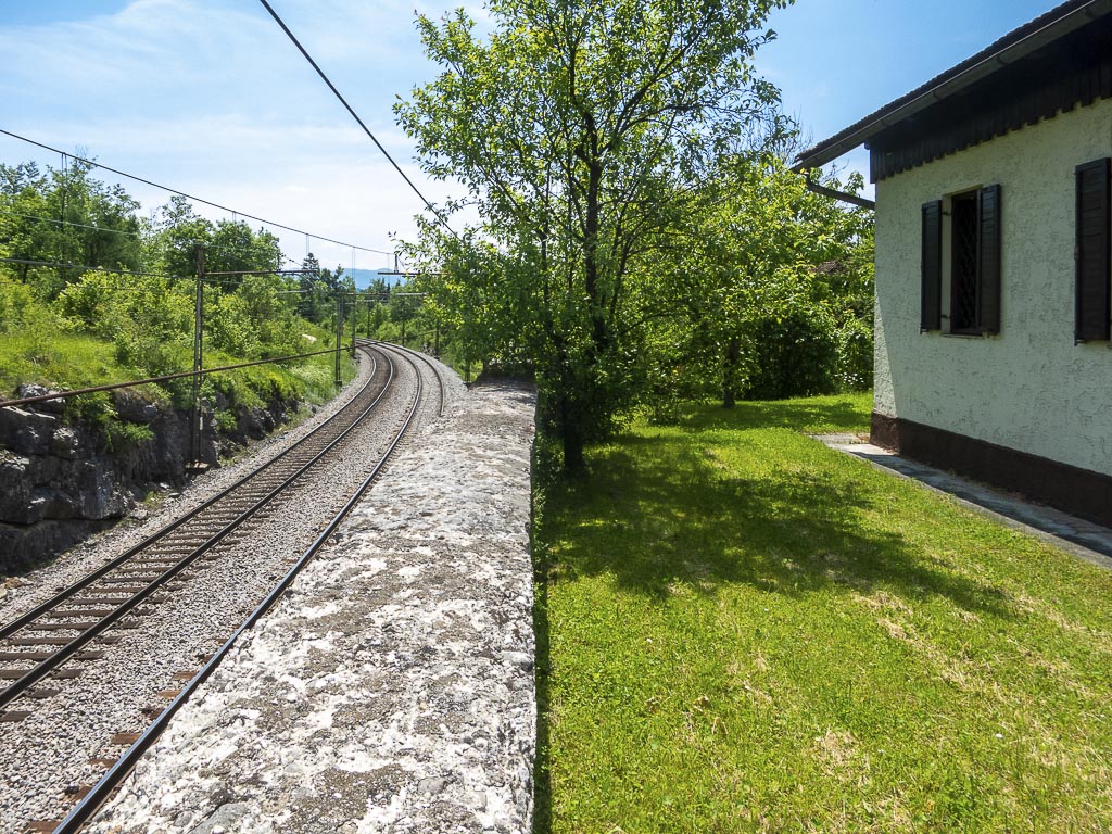 Pogled od čuvajnice 705/445 proti Rakeku. Nekatere čuvajnice so se nahajale nekaj metrov nad progo, da je bila zagotovljena boljša vidnostna razdalja do sosednjih čuvajnic. Zaradi boljše preglednosti so bile praviloma vedno grajene na zunanji strani krivine proge. Okolica čuvajnice je izredno lepo urejena, ob njej pa se nahaja še spominsko obeležje za “partizanski prehod.” Fotografija je nastala junija 2021.