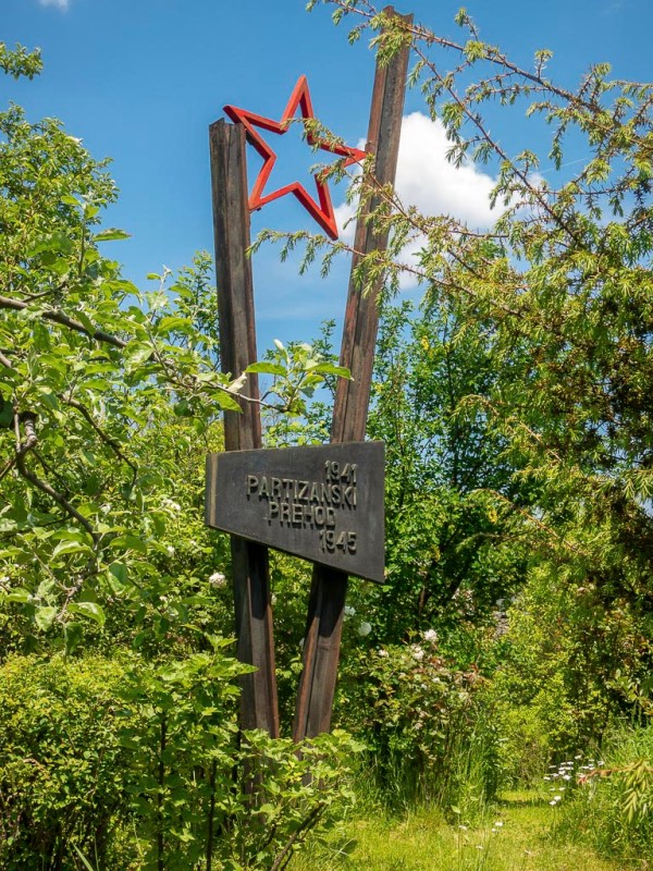 Železniško gospodarstvo Ljubljana (predhodnik Slovenskih železnic) je leta 1975 oz. 30 let po koncu 2. svetovne vojne postavilo 26 obeležij ob različnih progah po Sloveniji. Obeležje spominja na pogoste partizanske ali kurirske prehode preko proge v času vojne. Pomemben in stalen kurirski prehod je bil tudi ob čuvajnici 705/445. Obeležje iz dveh železniških tirnic, peterokrake zvezde med njima in napisne table, je bilo postavljeno junija 1975. Fotografija je nastala junija 2021.