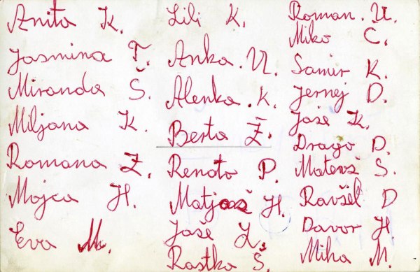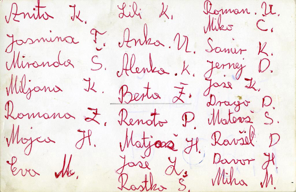 - Druga vrsta: Jože Leskovec (Dolenje Jezero), Matjaž Harmel (Cerknica), Renato Ponikvar (Cerknica), Alenka Kovačič (Dolenja vas) in razredničarka Ludovika Bavdek.