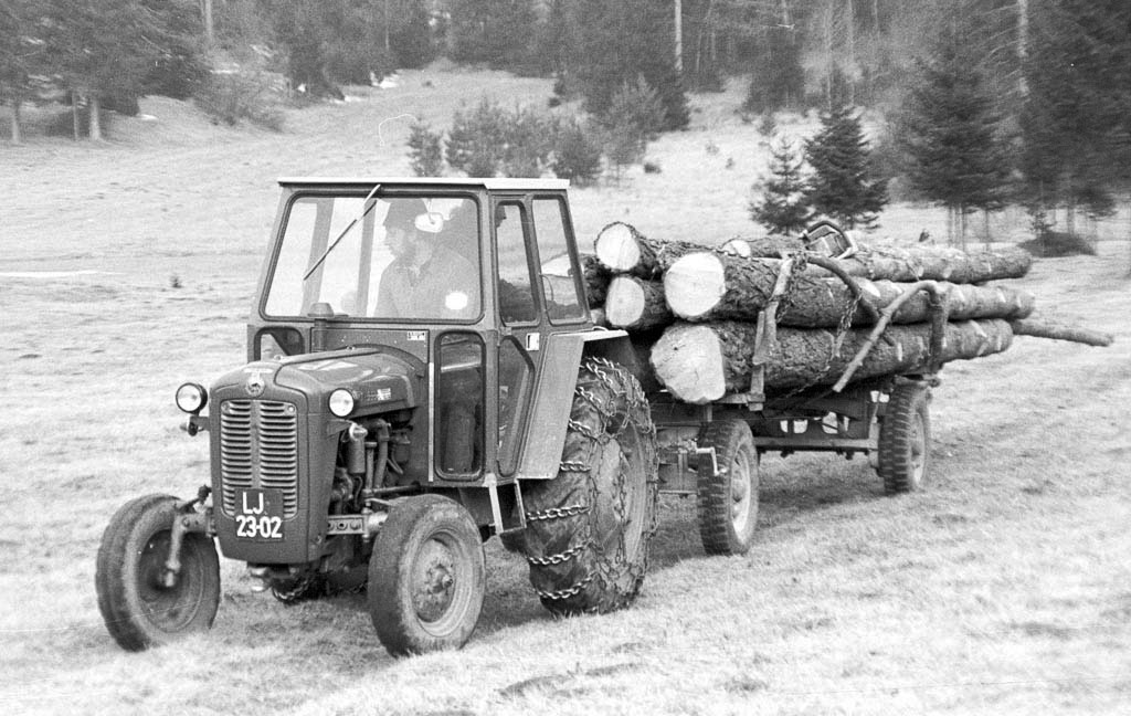 Na fotografiji traktor Ferguson F 35 s polovičnima gosenicama, na njem Ivan Strle iz Kozarišč, traktorist TOZD Gozdarstva Snežnik.