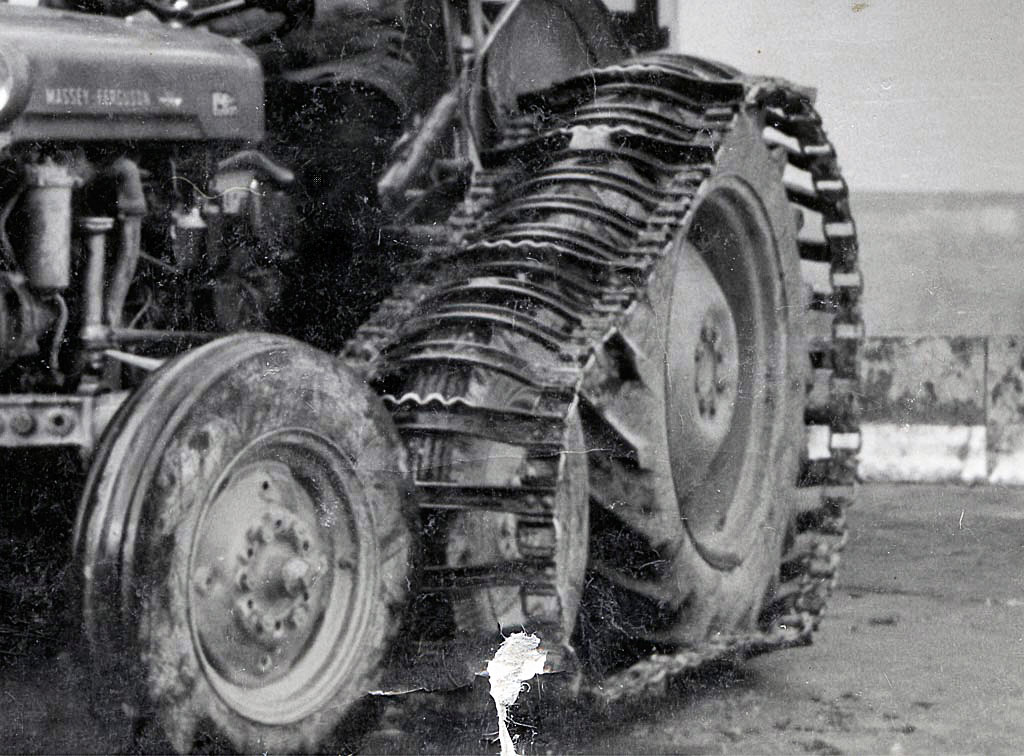 Standardni gozdarski Ferguson -·F-35 je imel goseničaste verige na zadnjem kolesu, zoženi gozdarski Ferguson F-35 pa polovične goseničaste verige. Tu je lepo vidna polovična gosenična veriga.