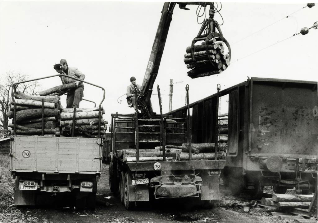 Trije ramparji leta 1977, od leve proti desni: Anton Berdon, Viktor Opeka in moj ded Franc Galanti, prekladajo klaftre iz vagona na tovornjak TAM 4500 avtoprevoznika Antona Ravšlja z Rakeka. V vsakem vagonu je bilo za najmanj dva zvrhana tovornjaka lesa.