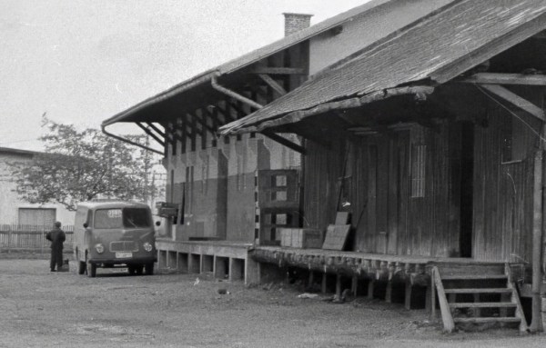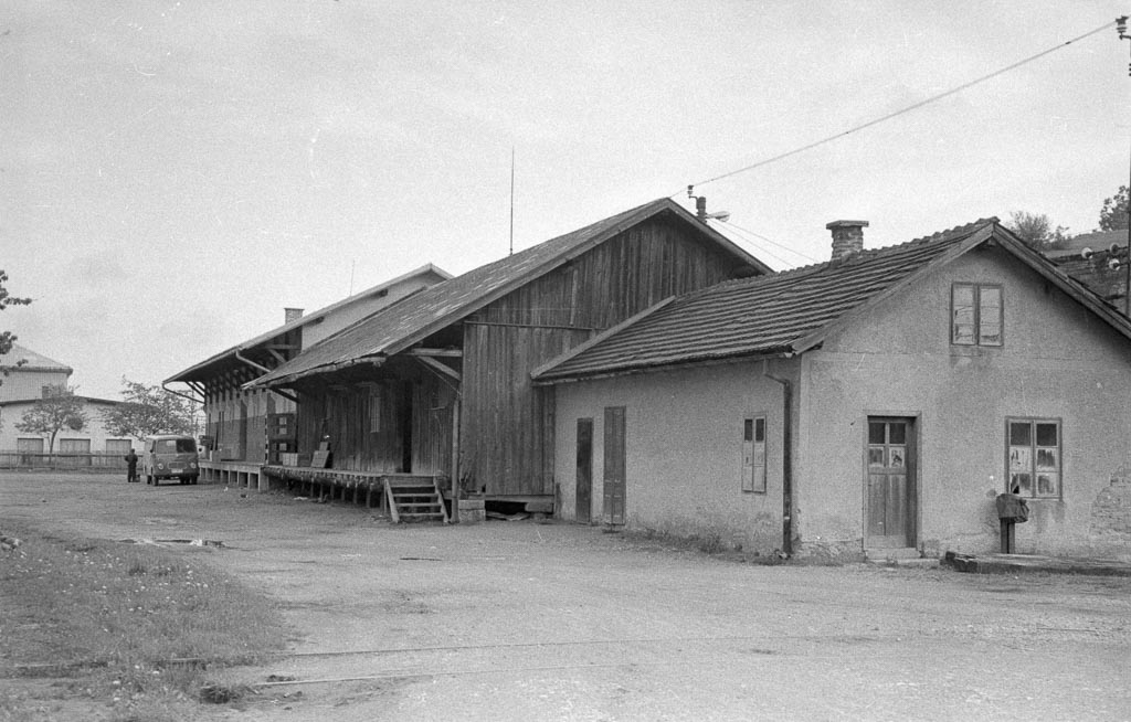 Pogled na tovorni del in skladišča postaje Rakek leta 1966. Zidano skladišče, pred katerim je furgon TAM, je bilo zgrajeno skupaj z izgradnjo Južne železnice 1856. Ker so bile potrebe po skladiščenju blaga na Rakeku velike, so na prelomu iz 19. v 20. stoletje zgradili še leseno skladišče. Zadnji zidani objekt je bil zgrajen leta 1922, v njem pa je tudi bilo priročno skladišče in mizarska delavnica. Od vseh treh objektov danes stoji le še najstarejše tovorno skladišče. Preostala dva sta bila porušena v prvi polovici 70. let prejšnjega stoletja, zamenjalo pa jih je sodobno tovorno skladišče z nakladalno rampo, ki je še vedno v uporabi.