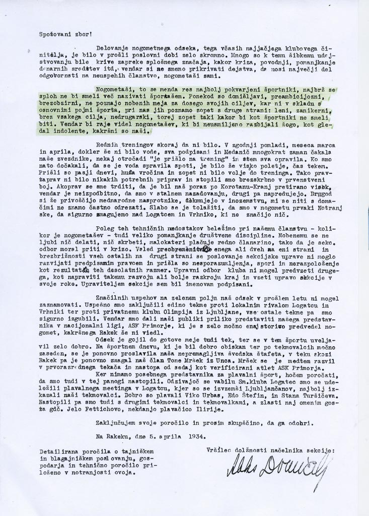 Poročilo je napisal za sejo upravnega odpora, ki je bila 5. aprila 1934. Na njej so obravnavali vsa poročila predsednikov sekcij ter sestavili predlog vodstva za naslednje poslovno leto. Sledil je občni zbor 8. aprila 1934 v Ševarjevi gostilni, ki je brez razprave sprejel vsa poročila.