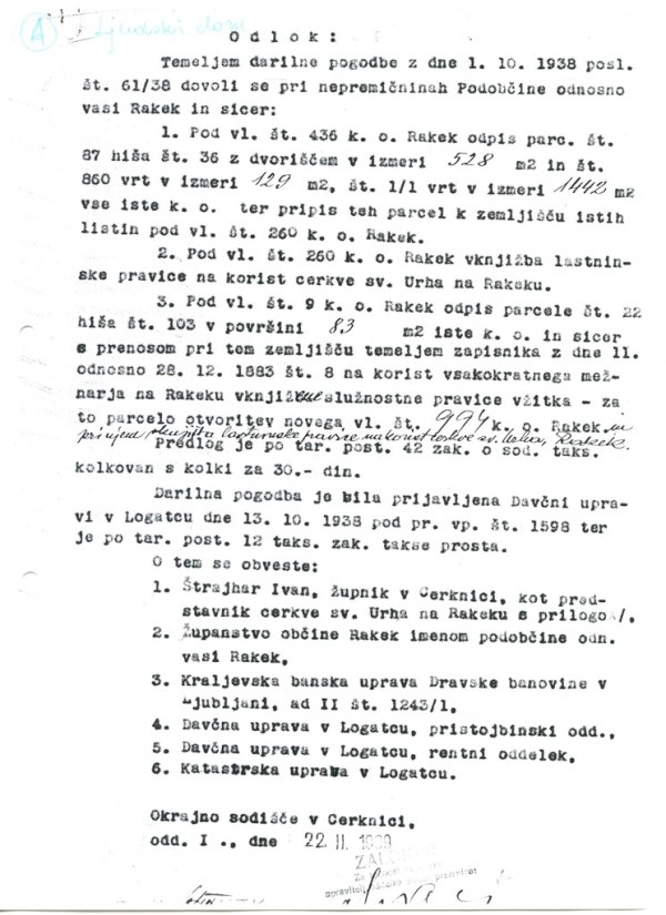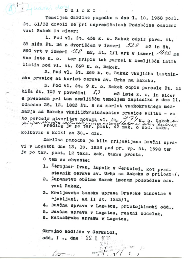 Darilno pogodbo so prijavili davčni upravi v Logatcu 13. oktobra 1938 in o tem so bili obveščeni: Ivan Štrajhar, župnik v Cerknici, kot predstavnik cerkve sv. Urha na Rakeku, Županstvo občine Rakek, Kraljevska banska uprava Dravske banovine v Ljubljani, Davčna uprava v Logatcu, pristojbinski urad, Davčna uprava v Logatcu, rentni oddelek in Katastrska uprava v Logatcu. Darilno pogodbo je 22. februarja 1939 registriralo Okrajno sodišče v Cerknici, Oddelek I. Za županstvo so bili podpisniki župan Andrej Modic in odbornika Mirko Vidrih in Ivan Turšič. V mežnariji so stanovali rakovški mežnarji: Matevž Steržaj, Andrej Matičič, Matija Šemrov, Jakob Ule, Janez Gabrenja, Franc Pirc in Ivan Slabe, ki se je kasneje preselil v župnišče.