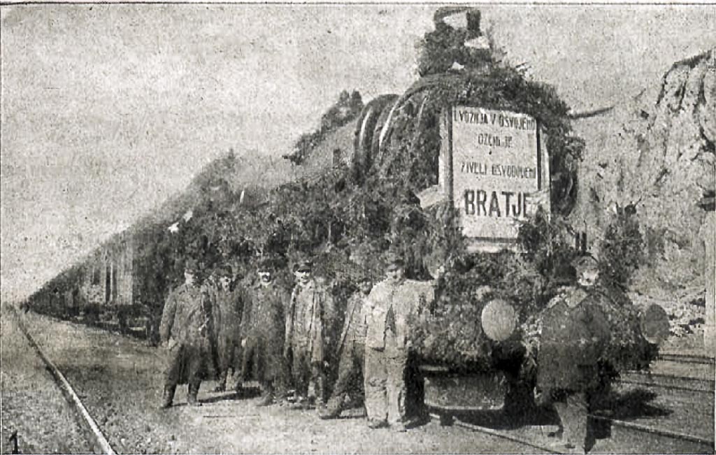 Okrašena lokomotiva prvega jugoslovanskega vlaka v svobodnem Logatcu z napisom: