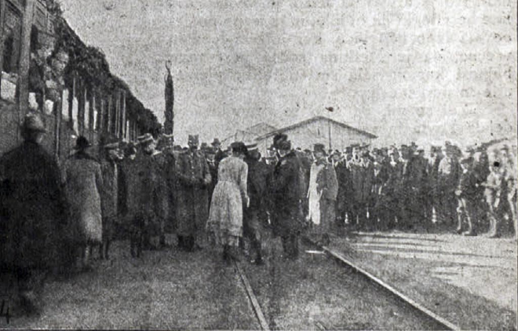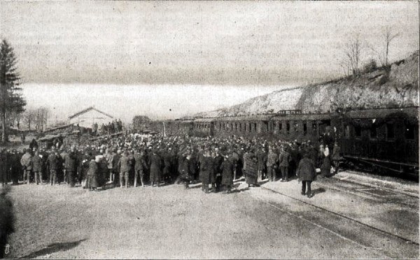 Vlak je ustavil. Karabinjerji in alpini so stali v vrsti. Bila je kratka počast generalu Vacchelliju in našim zastopnikom. Nato je pozdravil došle zastopnike jugoslovanskih oblasti gornjelogaški župan nadučitelj Punčuh, za njim gdč. Serini, gdč. Hodnikova, za Orla Pečkaj in za Sokola Smole. Po oficielnih pozdravih je bil salut medsebojnih čet. Naši visoki Valjevci so se vstopili nasproti malim italijanskim bersaljerem in karabinjerjem. Izmenjali so se medsebojni pozdravi. Takoj so začeli naši železničarji prevzemati službo. V nekaj minutah je pri blagajni že bil jugoslovanski blagajnik, ki je izdajal vozne liste za Jugoslavijo in dalje.