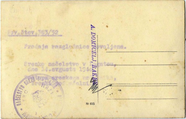 Kako okrog prinesti državo je bil nacionalni šport v kraljevini in socialistični Jugoslaviji. Slednja se je bolj (s pomočjo ovaduhov) ali manj (zaradi iznajdljivosti posameznikov) uspešno borila proti utaji davkov. V kraljevini pa so bile zadeve kljub vsemu veliko bolje urejene in nadzorovane. Finančna kontrola je opravljala nadzor nad dohodarstvenimi pristojbinami. Sem so sodile trošarine in razne takse na prodano blago. Finančna kontrola je bila prvotno zamišljena kot dohodarstvena straža za pobiranje trošarin, monopolnih taks in podobnih dajatev. Financarji so lahko izvajali tudi aretacije. Posledično iz tega izhaja, da je bilo treba prodajo vsega prijaviti in dobiti dovoljenje. Aleksu Domicelju je Srezko načelstvo v Logatcu izdalo dovoljenje št. 383/52 za prodajo razglednic s podobo spomenika kralju Aleksandru. Dovoljenje je dobil 14. avgusta 1940. Ker so bili očitno bolj šparovni in z več zdrave kmečke pameti, niso izdali odločbe, temveč so dovoljenje zapisali in z žigom potrdili kar na razglednici.