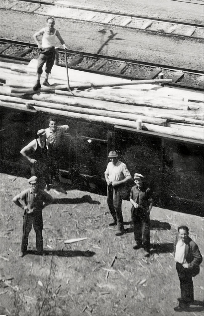 Na vagonu je Stane Bambič, ki v rokah drži capin. Pred vrati vagona stoji Viktor Opeka, ostali ramparji niso znani. Po oblekah sodeč je vagon naložilo 6 ramparjev. Mož v spodnjem desnem kotu je verjetno njihov nadzornik. Na fotografiji pogrešam svojega deda, ki je bil tedaj verjetno na delovnem dopustu, saj je bilo poletje in na kmetiji je bilo treba vse travnike pokositi ročno. Traktor je na kmetijo prišel šele 10 let kasneje.