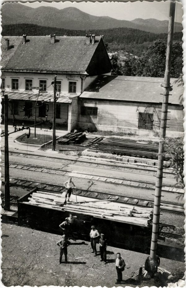 Rakovški ramparji so ročno naložili vagon obeljenega lesa. Na postaji so vidni stebri električne vozne mreže, ki so bili v celoti postavljeni leta 1956. V ozadju je objekt nekdanje carinarnice s skladiščem. Na mestu skladišča so leta 1965 začeli graditi novo pekarno s skladiščem in pisarnami. Fotografija je torej nastala med letoma 1956 in 1964, verjetno pa okoli leta 1962. Kuliso v ozadju predstavljajo Javorniki, smučišča Kalič pa tedaj še ni bilo. Na vrhu stebra z oprijemali za plezanje so reflektorji, ki so v nočnem času osvetljevali železniško postajo.