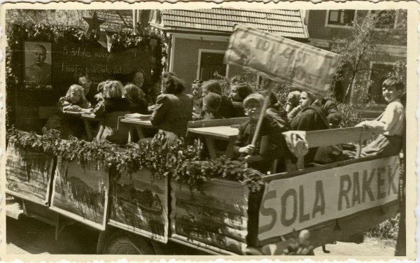 Na tabli je še slika Tita in na vrhu peterokraka zvezda. Kamion je lepo okrašen z zelenjem, ovešenimi plakati in na zadnji stranici napis ŠOLA RAKEK.