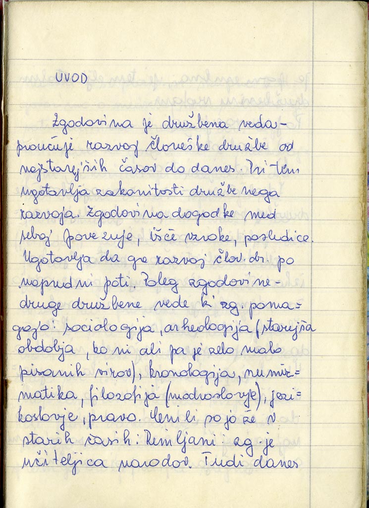 Na sliki je prva stran zvezka za zgodovino iz prvega letnika gimnazije oziroma stran nareka prve ure zgodovine v prvi gimnaziji. Zgodovino me je učil prof. Franc Zupan. Kupila sem tudi knjigo, ki je nisem odprla niti enkrat. Ni bilo potrebe. Prof. Zupan je govoril, mi smo pisali s turbo pospeškom. Kar je povedal, je spraševal. Dodatno izobraževanje je bilo rezervirano za tiste, ki jih je zgodovina specialno zanimala. Takih je bilo prekleto malo, vključno z mano. Zanimalo nas je vse kaj drugega.